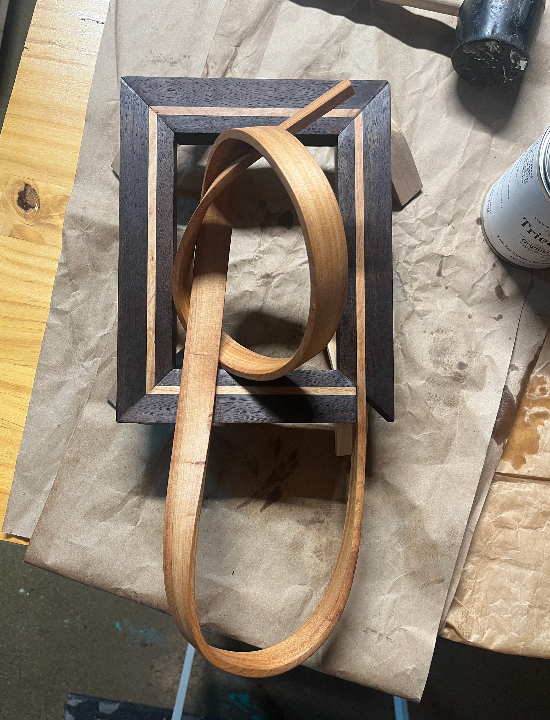 Each frame starts the same way, 4 sides cut to length and glued together. The frames are assembled and the inlay tail is placed inside a steam box. Surrounding it with steam the cypress becomes pliable. When it reaches temperature it’s pulled from the box and then the clock starts. Roughly 30 seconds to a minute the steamed wood will be pliable. While the clock is ticking the frame is braced and the cypress tail is bent and twisted. In this short period of time or long depending on how it’s measured, instinct and feeling take over, slipping into a TEE (Time Expansion Experience) where time takes on a different pace. A dance of sorts unfolds and the moment slows becoming a give and take with the material as the ‘clock’ ticks away.